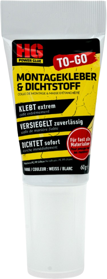 HG Power Glue Assembly Adhesive & Sealant To-Go is the fast solution for projects that require immediate bonding and simultaneous sealing. Whether dealing with leaks, loose components, or spontaneous repairs, this practical tube ensures you are ready for action at any time without any additional tools.