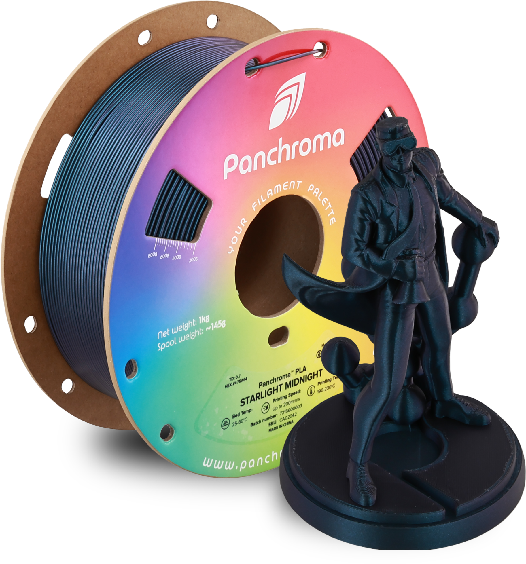 Bring a whole new brilliance to your 3D prints with Panchroma™ Starlight PLA by Polymaker. This special filament creates a shimmering effect that changes colour with the light, giving each model a dynamic, eye-catching finish – reminiscent of stars twinkling in the night sky.