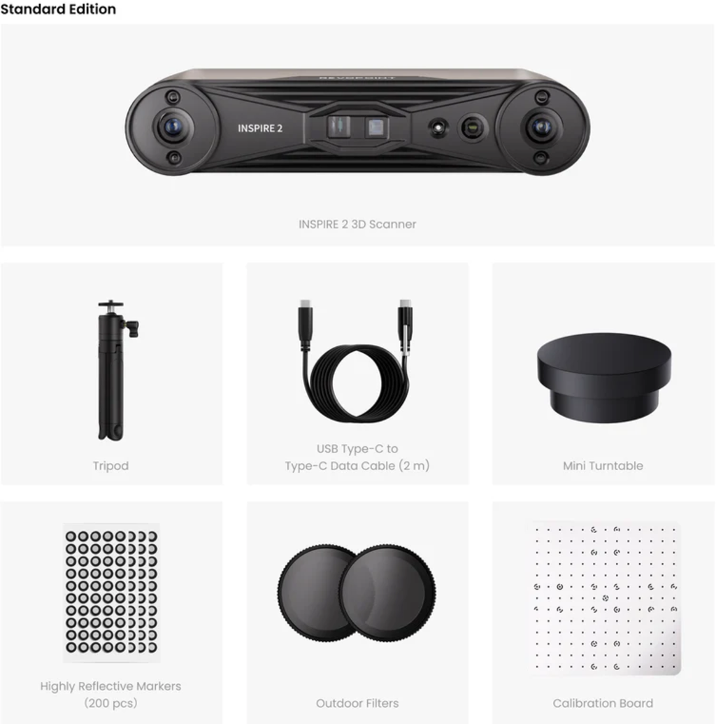 1 x INSPIRE 2 3D Scanner 1 x Tripod 1 x USB Type-C to Type-C, 2 m length 1 x Mini turntable 200 x Highly Reflective Marker Outfoor Filter 1 x Calibration chart 1 x Mobile phone holder 1 x Power Bank (4000 mAh) 1 x Quick Release Plate 1 x 2-in-1 mobile cable |