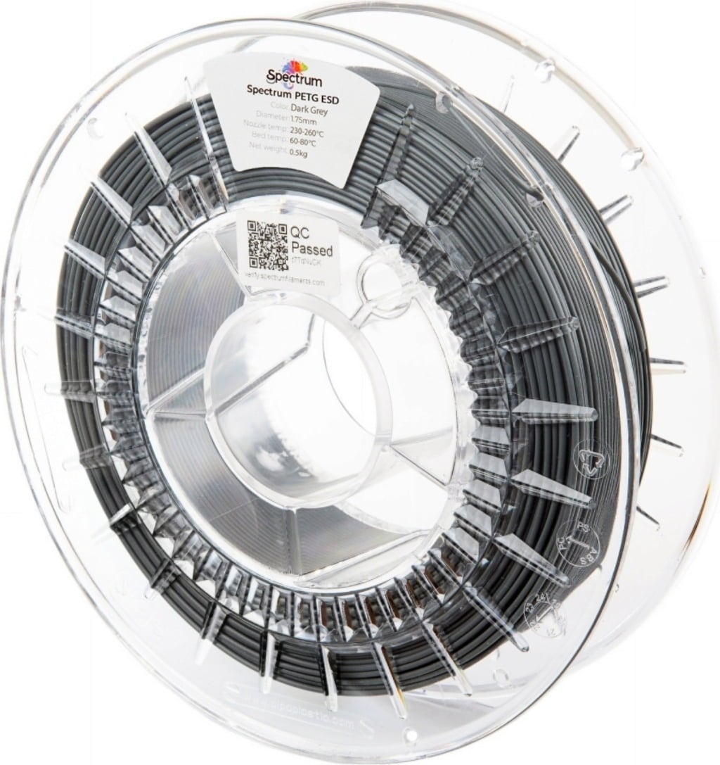 In contrast to many other ESD filaments, Spectrum PETG ESD is based on a non-migratory antistatic modification. This means the effect remains permanently stable and is not dependent on environmental moisture or ageing. Your components will have constant ESD protection throughout their lifespan, even in changing ambient conditions. Spectrum PETG ESD retains its PETG properties, such as high impact resistance, excellent layer adhesion, minimal shrinkage, and very good dimensional accuracy.