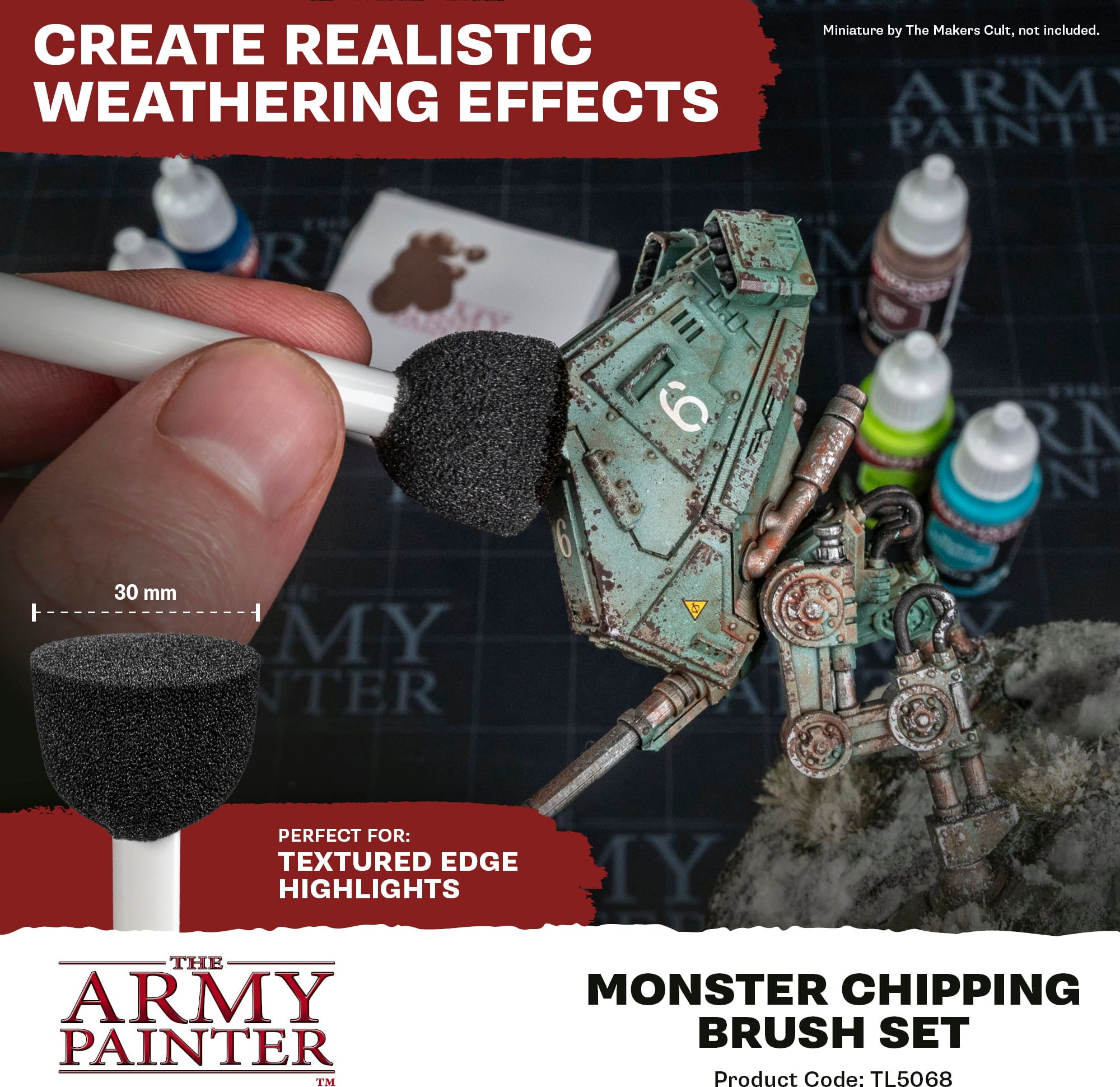 The Army Painter Monster Chipping Brush Set is the ultimate tool for creating realistic weathering and wear effects on landscapes/terrain and large miniatures. With these extra-large brushes, you can effortlessly achieve scratches, chipped paint, and worn surfaces that give your models an authentic used look.