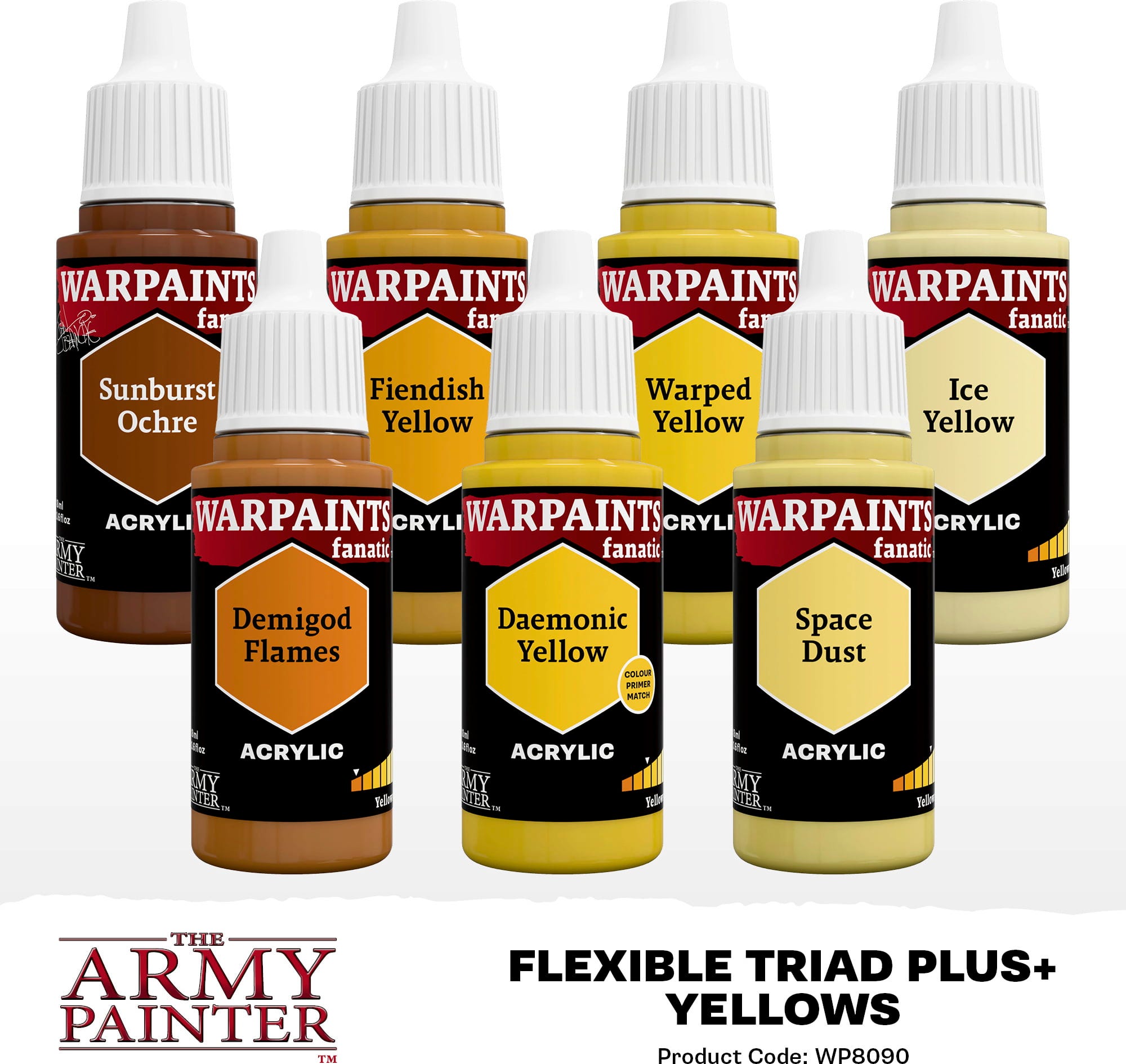 Bring vibrant colours to your painted miniatures with The Army Painter Warpaints Fanatic: Yellow Flexible Triad PLUS+ Set. This comprehensive spectrum covers everything from deep, warm shadows to brilliant highlights that make your miniatures pop! The six colours within the Yellow Flexible Triad are perfectly harmonised, allowing you to create smooth transitions effortlessly - no guesswork required. Just open, paint, and enjoy the results.